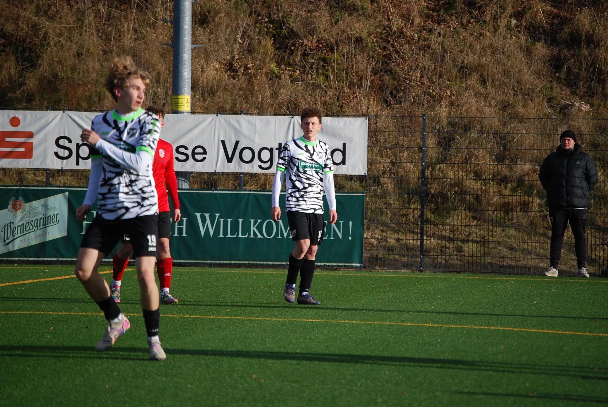 Das Spiel begann mit hohen Tempo die Jungs aus Treuen pressten hoch und machten es uns nicht leicht. Bereits in der 2. Minute mussten wir wechseln, als sich unser Kapitän P. Tautenhahn verletzte. P. Knoll ersetze ihn. In dieser Phase hatte Treuen leichtes Übergewicht. Es dauerte etwas, bis wir uns stabilisierten und selbst wieder aktiver wurden. In der 19. Minute dann die Führung für uns. Der Torhüter konnte einen Ball von Ti. Schneider noch klären, P. Lehmann schaltete am schnellsten und schob den Abpraller ins Tor. Treuen blieb aber weiterhin giftig und hatte gar in der 30. Minute die Chance zum Ausgleich. Die Direktabnahme nach Flanke flog knapp über unseren Kasten. Nach 36. Minuten konnte wir unsere Führung ausbauen. To. Schneider presste auf den ballführenden Verteidiger und eroberten den Ball. Dieser gelangte zu P. Lehmann, der über Torhüter hinweg einnetzte. Mehr passierte bis zur Pause dann nicht mehr.